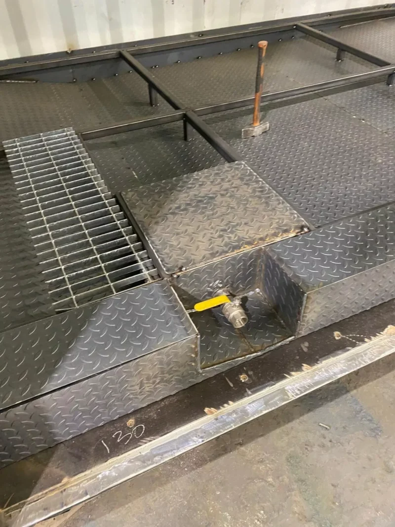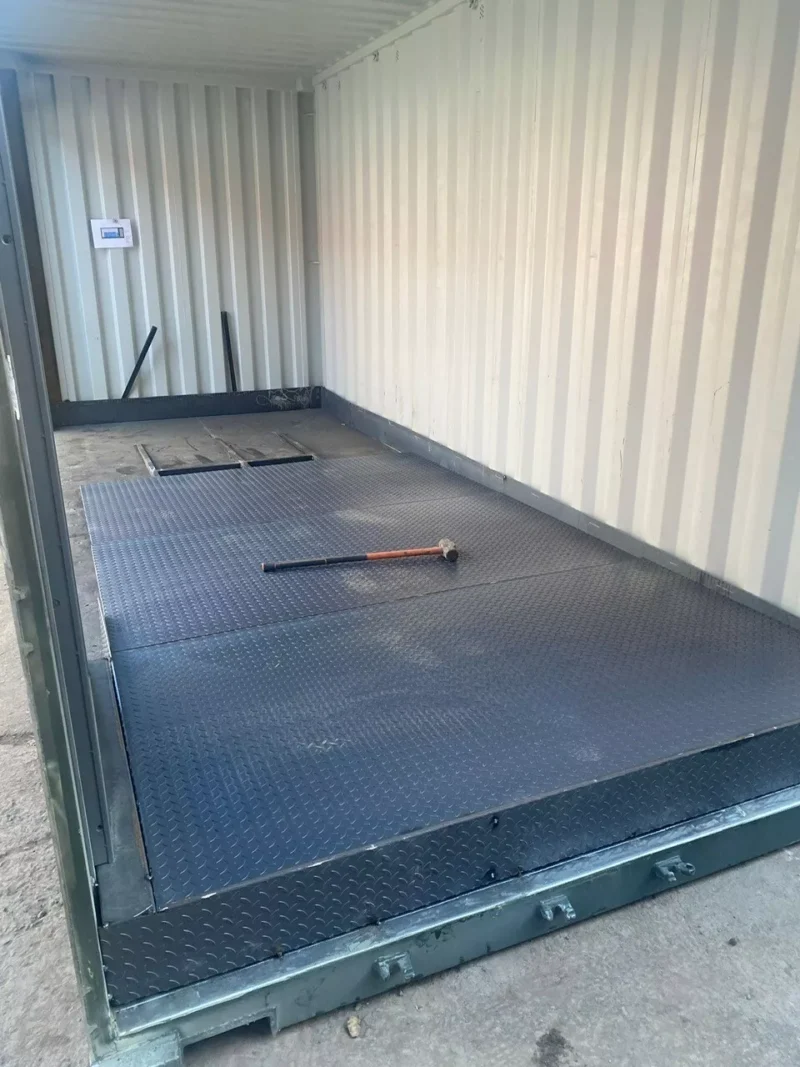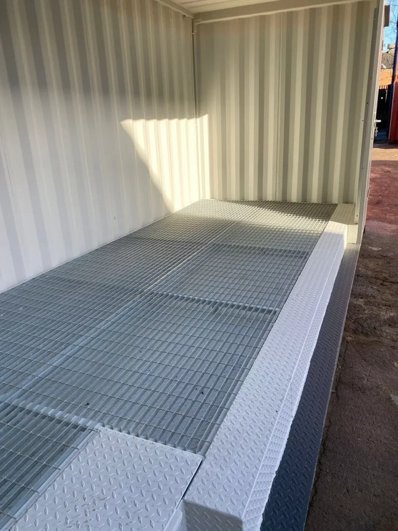 20ft x 8ft High Cube 1 Trip (New) Shipping Container Chemical Stores fitted with x 1 Galvanised Electric Roller Shutter, x1 10 point locking security personnel door, resprayed in a dark RAL colour of choice, sloped mild steel chequer plate flooring with bund on fully supported framework, raised grated flooring, hinged inspection hatch, Grafotherm Anti Condensation Treatment to internal roofline