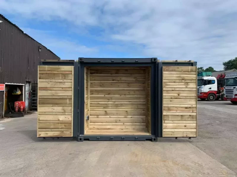 A used, refurbished container with cladded area which can be used as storage. As you can see in the picture it’s being used as an outside area for a TV and the interior is being used as a bar area from which to serve drinks. This is particularly useful when there’s football, rugby, olympics, tennis etc. on and you want a safe area for your customers/guests to watch the games.