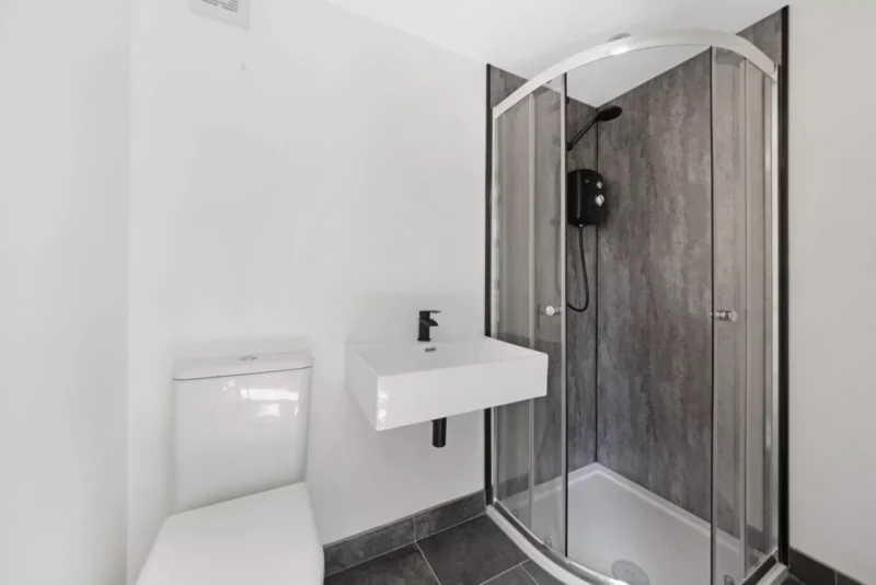 Built to high spec , this open plan living space with separate bathroom is spacious and light and airy.
